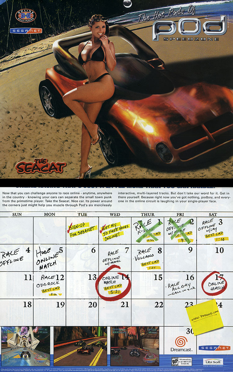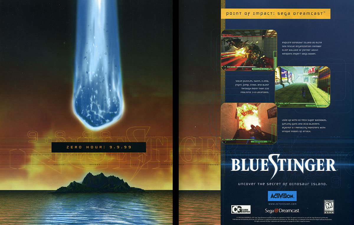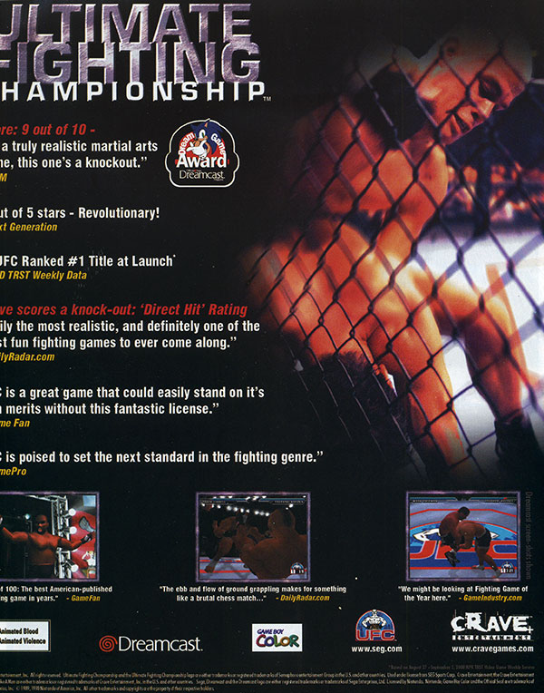 Motivation to buy a particular game can usually be stimulated by seeing video or screenshots, the pedigree of the developer, or by word of mouth. Before the advent of a mostly digital age taking hold, print media was the most opportunistic way for publishers to reach gamers. I always loved (and still do) flipping through page after page and seeing the fun ways that every game used to stand out. It would often reaffirm I wanted to buy a particular game or enticed me to look into one further. Often times this is sending the message subconsciously which may not initially unveil itself but I feel the impact it had during that era cannot be overstated.So without further adieu, let’s look at some of the most notable cases for the US market. The BestSoul CaliburThis may be one of the greatest ads of all time. It’s so poignant and just pure genius. Simple, bold, and smart. As soon as you see it, you get it right away. I love how it’s three pages and builds up, peaks at the middle, then just wraps it all together at the end. The line about it being the game turning you into a proud owner of the Sega Dreamcast speaks to the passion most gamers felt when they first experienced their system. It can be debated which title was more impactful, Soul Calibur or Sonic, for the Dreamcast launch but I feel this nudges it in Soul Calibur’s favor ever so slightly. Blue StingerWhen I first saw this in print, it gave me a lasting impression that I can still fondly look upon now. Overall I think the design is excellent and it’s impressive to create such weight to the pages with only a small amount of graphical elements. The left page is striking, demands your attention, and it cleverly ties in the launch of the game. There is also some mystery to it so it really piques your curiosity. Suffice to say I did not forget to play Blue Stinger in September of 99’. Super Magnetic NeoThe artwork is beautiful with a nice array of vibrant colors fused with more subdued tones to create a great balance. It just draws your gaze as soon as you flip the page and makes me feel like I’m being drawn into this hypnotic world. There’s a buoyant flow to the layout and a fun tagline that perfectly encapsulates the gameplay and goofy atmosphere. Sword of the Berserk Guts’ RageOriginally I did not give too much thought to this ad years ago. However, when I was researching for this article I had a newfound appreciation for it. It’s one of the few ads where an in-game model (albeit a touched up high resolution version) still holds up well today. I love how it thrusts Guts’ Dragon Slayer at an angle towards you and you can really feel how monstrous that slab of steel truly is. I think it succeeds in showing how visceral the combat can be with just a few screenshots. NBA 2k1/NFL 2k1A fine example of a smartly crafted ad that really drives home how big an addition of online play to console sports games was at the time. The NBA 2k1 version has remarkable Photoshop work to convert the streets to a wood floor complete with accurate reflections. I like the rich blue sky in the NFL2K1 ad that thoughtfully utilizes SEGA’s branding color. It’s very effective messaging and clearly highlights the biggest feature of the game(s). The WorstPod Speed ZoneYeah it’s been said that sex sells but I don’t care how good looking and well-endowed the woman is when that Po(o)d car is so generic and uninspiring that I wouldn’t give this game a second thought. On paper it’s a relatively good concept but it doesn’t work when using this game’s assets. Even the perspective is off since the background has a smaller focal length while the bikini model has a flat perspective. It’s funny that according to the calendar, you are a “small town punk” if you don’t know your cars. Well, I prefer the term fiscally responsible since I didn’t waste my money. Jeremy McGrath Supercross 2000Jeremy McGrath Supercross 2000 is a flawed game. It is considered the worst Dreamcast game according to the Official Dreamcast Magazine. I think the print ad doesn’t mask that fact but Activision should’ve been ashamed to waste a part of a tree on this. It was actually hard for me to find this advertisement when I searched for it which is quite telling of its inconspicuousness. F355 Challenge Passione RossaI had to put this in here just because of how lackluster and average it is for such an iconic Yu Suzuki game. It has a straight forward, mundane tagline that leaves little to the imagination. There is also some unusual visual hierarchy where it doesn’t lead your eyes in a natural way. Sometimes I look at the middle first but I also look at the top other times. SEGA seemed to have phoned it in on this piece unless Acclaim was to blame. CarrierLook away…it’s hideous! Agh the horror! Well I’m sure that’s the reaction they wanted but for all the wrong reasons. I think more care was put into Shenmue’s Yokosuke bystander #15 than this nefarious creature’s model. Not to mention that second page has just way too much text to read. I doubt most people took the time to read all of that and I wouldn’t blame them. I can see why I was never motivated to buy this when it first came out. UFC ChampionshipI know what you are thinking: “Eric must’ve really done a bad job with preparing this ad, it’s totally over-cropped.” Well, you can attribute that to there almost being no padding to the left of the page! This is just one of the flaws that show the overall lack of care put into this layout. I remember this game getting great reviews but I would be surprised if this print ad had any positive influence on its sales. I think it’s fun to look at another aspect of a video game other than the game itself. From the advertising, to the game case insert or manual, these are all a part of that game’s makeup and are a multi-faceted representation of the creativity and passion put into (nearly) every product. |